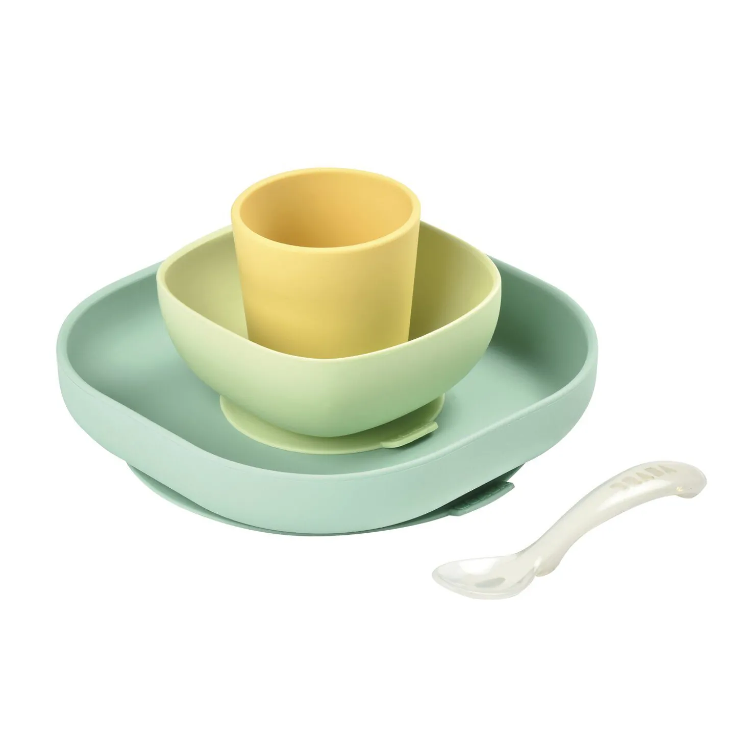 Il est composé de la vaisselle essentielle pour les premiers repas avec ses 4 pièces : une assiette et un bol avec ventouse, un petit verre et une cuillère en silicone 2ème âge. La ventouse sous l’assiette et le bol permet de les fixer à la table ou à la tablette de la chaise haute, évitant ainsi les incidents et renversements. La discrète languette permet aux parents de soulever l’assiette et le bol facilement lorsque le repas est terminé.