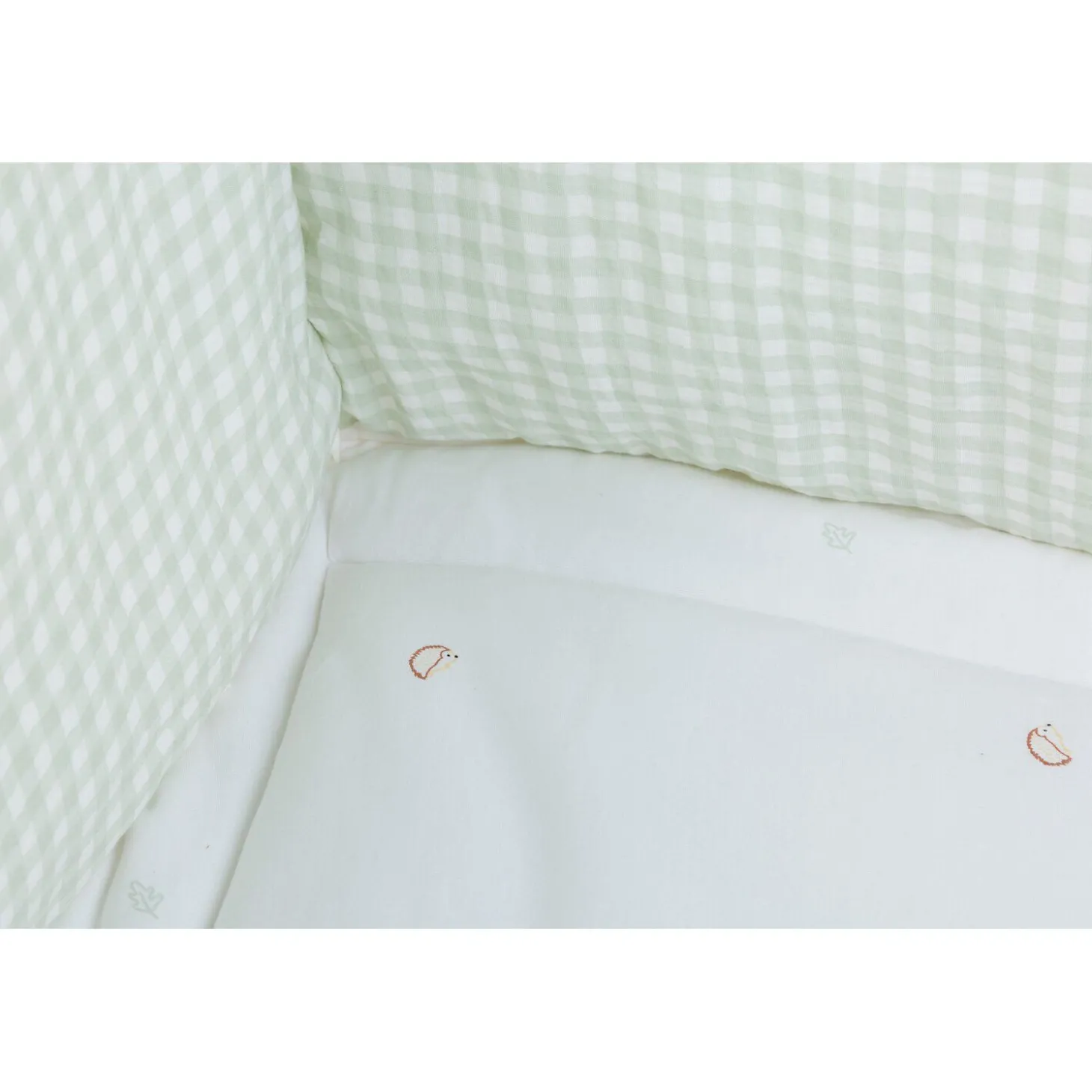 Tapis de parc avec imprimé sur le thème de la forêt, en coton jersey doux, agréable et de haute qualité. Extrêmement confortable pour jouer ou se reposer. Le tapis de parc peut être utilisé des deux côtés. Le tapis de parc a un coté vichy vert et un côté avec un imprimé forestier (cœurs, feuilles et hérissons).Remarque: le tapis de parc seul ne convient pas pour faire dormir votre bébé.